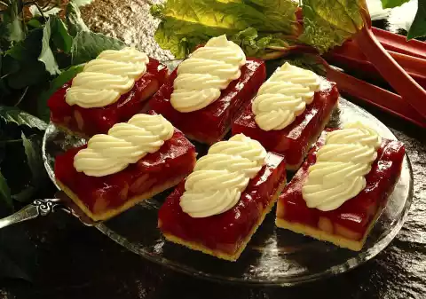Carefully remove the short pastry base from the baking tray and let it cool down. Clean, wash and cut the rhubarb into pieces. Peel, quarter, core and chop apples. Mix the fruit with sugar, cinnamon and coriander and leave to stand for about 30 minutes. Bring to the boil with a little water, cover and steam for 10-15 minutes. Drain the compote and let it cool down. Collect the juice. Cover the short pastry base with wafers. Close the open side of the baking tray with an aluminium foil tray. Spread the compote on the shortcrust pastry base. Add the juice to 1/2 litre liquid with water. Mix the juice, cake glaze powder and sugar in a saucepan and bring to the boil while stirring.
