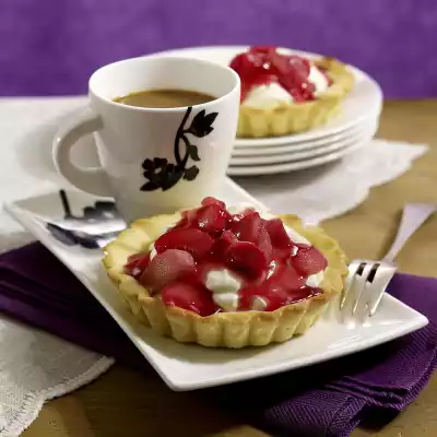 Remove the Tarteletts from the moulds. Pour the mascarpone cream into the moulds. Add the rhubarb compote.