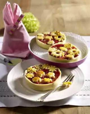 Bring cherry nectar, sugar and vanilla pulp to the boil. Add the rhubarb and simmer covered for about 2 minutes. Stir the starch with a little water until smooth, remove from heat and stir in the starch. Simmer for about 1 minute while stirring. Pour into a bowl and let cool down lukewarm. Grease 8 tart tin forms (bottom 8 cm Ø, top 10 cm Ø) and dust with flour. Roll out the dough on a floured surface and cut out 8 circles (about 11 cm Ø). Line the moulds with them. Cut out flowers from the remaining dough. Divide the rhubarb compote into the ramekins and decorate with short pastry flowers.