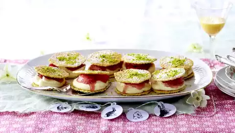 Finely grind the pistachios in the universal chopper. Beat the chocolate glaze cream with the whisk of the hand mixer for 4-5 minutes until stiff. Pour cream into a piping bag with perforated spout, squirt onto 8 butter wafers, add some compote and cover each with another butter wafer.