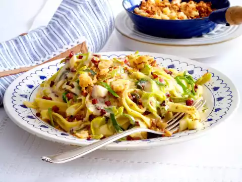 Add the pasta to the boiling salted water and cook according to the instructions on the packet. Sprinkle leek with flour, sweat it and while stirring, deglaze with cream and 1⁄4 l water. Bring to the boil and simmer for about 5 minutes.