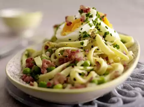 Drain the eggs, quench briefly, remove the shell and turn in the chives. Halve the eggs. Pour pasta and peas into a sieve, drain. Put the noodle-pea mixture into the pot with the ham cubes, cover and heat up briefly. Season with salt. Arrange the pasta mixture on serving plates with eggs