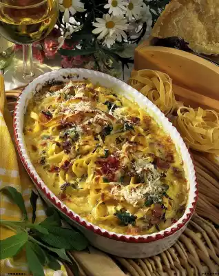 Deglaze with cream, milk and wine while stirring and let simmer for about 5 minutes. Stir in ham and sage. Season to taste with salt and pepper. Put the noodles into an ovenproof dish and pour the sauce over them. Bake in a preheated oven (electric range: 200 ° C / gas: level 3) for about 20 minutes. Sprinkle with parmesan
