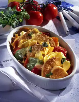 Sauté the bell peppers in the frying fat. Wash the oregano and pluck the leaves. Season vegetables with salt, pepper and oregano. Deglaze with tomato juice, boil down for 5 minutes at high heat. Mix pasta, meat and prepared vegetables and fill into an ovenproof dish. Grate the cheese and sprinkle over it. Gratinate briefly in the preheated oven on the highest setting