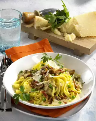 Deglaze the mushrooms with 100 ml water and milk and bring to the boil. Add peas and simmer for about 2 minutes. Stir in sauce thickener and bring to the boil briefly. Season to taste with salt and pepper