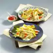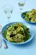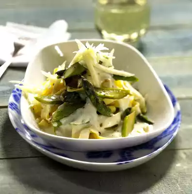 Season to taste with salt and pepper. Heat the oil in a frying pan. Fry the asparagus for 3-4 minutes. Pour the pasta onto a sieve and drain. Mix noodles and asparagus and arrange on plates with the sauce.