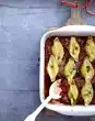 Peel and finely dice the shallot. Heat the fat in a saucepan. Sauté the shallot in it. Dust with flour, sweat on, deglaze with stock while stirring and bring to the boil. Coarsely grate the pecorino. Stir the ricotta and half of the pecorino into the sauce.