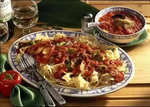Let it boil down for 10-15 minutes in the open pan. Cook the pasta in boiling salted water for 10 minutes. Drain and rinse briefly with cold water. Season tomato sauce with salt and cayenne pepper. Serve noodles with the sauce