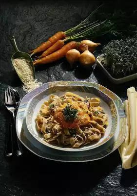 Put the pasta in plenty of boiling salted water and cook for 10-12 minutes. Finely puree the carrots with the cutting stick of the hand mixer. Season with salt, pepper and cayenne pepper. Roast sesame seeds until golden brown.