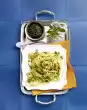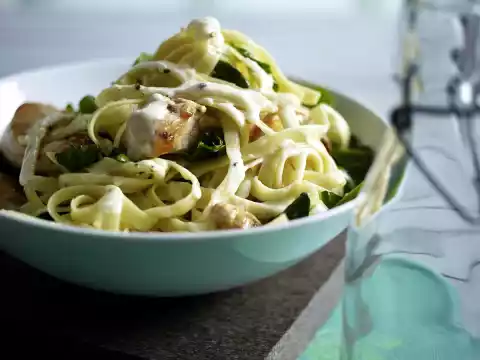 Wash and drain the spinach. Wash the meat, dab dry and cut into slices. Prepare pasta in boiling salted water according to package instructions. Heat 1 tablespoon of oil in a coated pan.