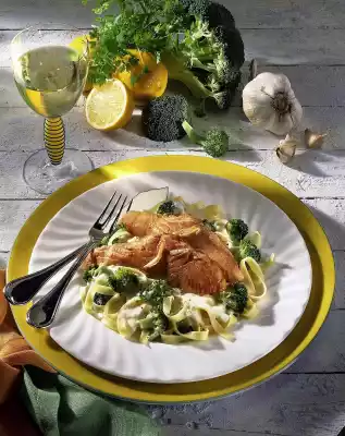 Heat oil and butter in a pan. Peel garlic, chop roughly and sauté. Add the salmon and fry on medium heat for about 2 minutes on each side. Season with salt. Drain the noodles. Heat broccoli and noodles in the sauce. Arrange salmon with creamy broccoli noodles on plates