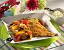 Let simmer for about 2 minutes. Season sauce with salt, pepper stock and half of the lemon juice. Cook pasta in boiling salted water for about 10 minutes. Wash the salmon, dab it dry and cut it into 8 pieces. Sprinkle with remaining lemon juice. Heat oil and butter in a pan. Peel garlic, chop roughly and sauté. Add the salmon and fry on medium heat for about 2 minutes on each side. Season with salt. Drain the noodles.