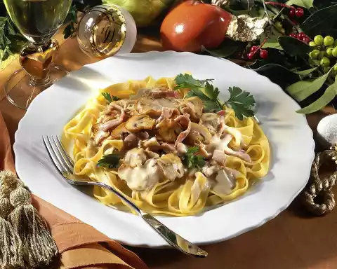 Stir in the sauce thickener and bring to the boil again. Season with salt and pepper. Drain the pasta and serve with the sauce. Garnish with parsley if necessary.