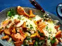 Preheat oven (electric cooker: 175 °C/circulating air: 150 °C/gas: see manufacturer). Line a baking tray with baking paper. Rinse the shrimps, dab dry and cut them in half lengthwise, removing the dark gut if necessary. Mix with 2 tablespoons of olive oil, some salt and pepper on the baking tray. Pre-cook in a hot oven for about 5 minutes.