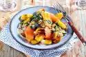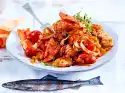 Cook the pasta in boiling salted water according to the instructions on the packet until al dente. Meanwhile peel onions and garlic, chop both finely. Heat 4 tablespoons of oil in a large frying pan. Brown the onions and garlic in it. Add prawns, capers, tomatoes and lemon slices. Fry for 2-3 minutes. Drain the pasta, let it drain for a short time and put it back into the pan. Mix in the shrimp mix, olives, ajvar and herbs. Season to taste with salt and pepper. Sprinkle with parmesan cheese if you like.