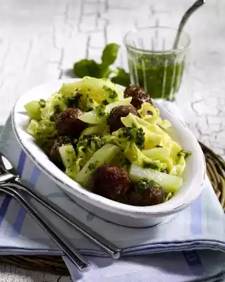 Cook the pasta in boiling salted water according to the instructions on the packet. Cook the kohlrabi for about 4 minutes. Heat oil in a pan and fry the meatballs in it for 7-10 minutes. Drain the noodles and kohlrabi and mix with the pesto.