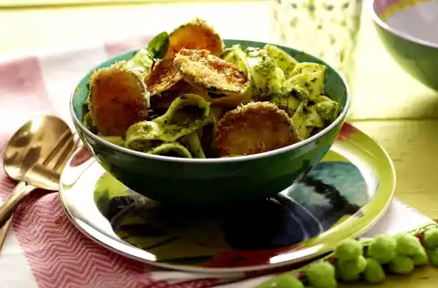 Cook the pasta in the boiling salted water according to the instructions on the packet. In the meantime heat up the clarified butter in portions in a large pan. Turn the zucchini slices first in flour, then in the egg and finally in the breadcrumb-parmesan mixture.