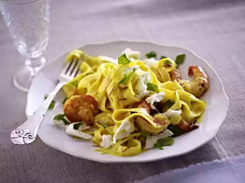 Drain the noodles, put them back into the pot, fold in the sauce and prawns. Arrange noodles and sprinkle with basil and mozzarella