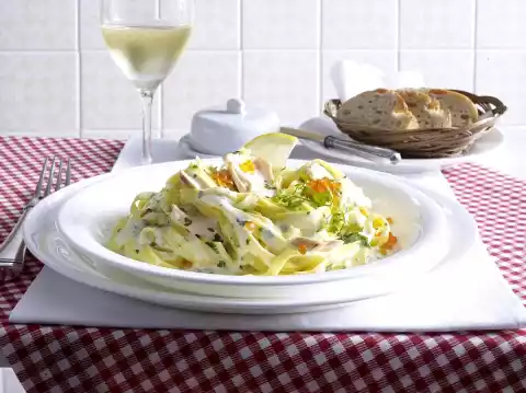 Finely chop the rest. Carefully crush the salmon into individual slices with a pallet or skimmer. Fold chervil into the sauce. Drain the pasta thoroughly, put it back into the pot and mix carefully with the sauce.