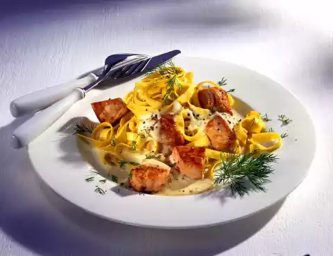 Season to taste with salt and pepper. Wash the dill, dab dry and chop coarsely. Add fried salmon cubes and dill to the sauce and fold in. Drain noodles and chill cold. Arrange on plates with the sauce and garnish with dill and serve.