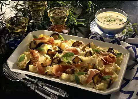 Season to taste with salt, pepper and lemon juice. Drain the pasta on a sieve and mix with the mushrooms. Halve the ham slices and arrange them on a plate with the noodles. Pour sauce over them and sprinkle with remaining sage leaves.