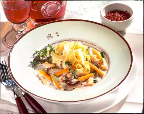 Wash the fillet, dab dry and cut into fine slices. Heat oil in a pan. Fry the fillet in it over high heat for 2-3 minutes, turning it over. Season with salt, pink berries and sherry. Deglaze with cream and retained vegetable stock, bring to the boil.