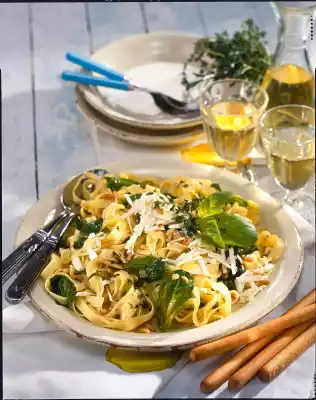 Season with salt and pepper. Meanwhile grate cheese roughly. Drain noodles, quench, drain and add to spinach. Mix well. Serve on a plate sprinkled with cheese. Garnish with basil as desired