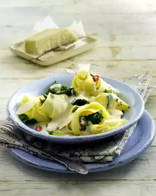 Clean spinach, pluck smaller, wash and drain. Prepare pasta in boiling salted water according to package instructions. Peel and finely chop the onion. Clean, wash and cut the chilli pepper into rings, removing the white seeds.