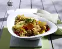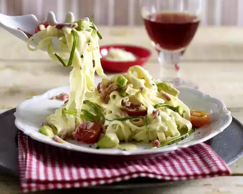 Add the bacon and tomatoes to the sauce and warm it up. Season with salt, pepper and lemon juice. Halve the avocado and remove the stone. Remove the flesh from the skin and cut into pieces. Drain the pasta, put it back into the pot with the avocado, spring onions and the sauce, mix everything carefully.