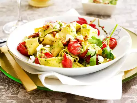 Heat 1 tablespoon of oil in a pan. Stew the tomatoes for 1-2 minutes. Drain the pasta, put it back into the pot and fold in the pesto and tomatoes. Arrange the pasta on plates and crumble the goat's cheese over it. Garnish with parsley