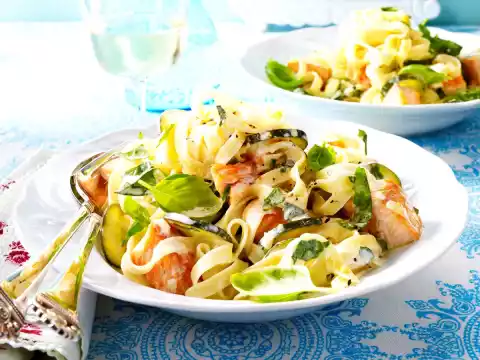 Wash and clean the zucchini, cut them in half lengthwise and cut into thin slices. Peel and finely chop the onion. Wash the fish, dab dry and cut into cubes. Cook pasta in boiling salted water according to package instructions
