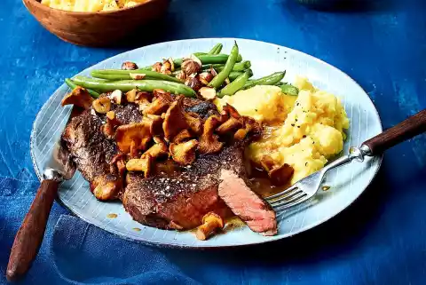 Heat 1 tablespoon of oil and butter in a second pan. Fry the chanterelles in it for about 3 minutes. Heat 1 tablespoon of oil in a saucepan. Sauté shallot in it until transparent. Add the beans and 2 tbsp. water and heat for approx. 2 minutes. Fold in nuts. Wrap the steaks out of the foil and pour the resulting gravy into the pan as a roasting mixture. Arrange everything.