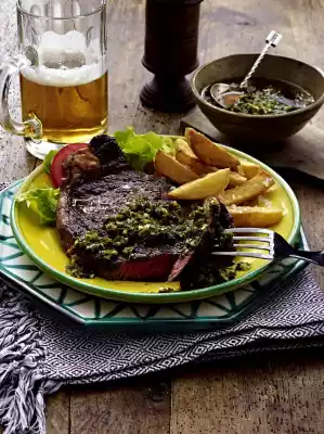 Heat the frying oil again to 180 °C and fry the potato wedges until they are golden brown. Drain and season with coarse salt. Serve with steaks and chimi churri. Serve with lettuce and tomatoes.