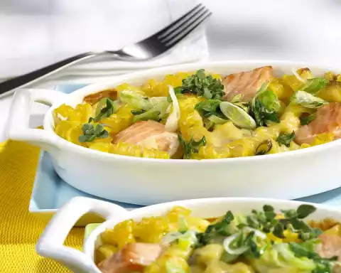 Wash the salmon, dab dry and cut into bite-sized pieces. Season with lemon juice and salt. Clean and wash spring onions and cut them diagonally into pieces. Fill noodles, salmon and spring onions into portion moulds and pour the cheese sauce over them.