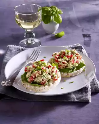 Finely puree the artichoke bases. Stir in the tomatoes, spring onions, almonds and basil, except for a little garnish. Season to taste with salt and pepper. Wash lettuce, dab dry and tear coarsely, spread on the rice cakes.
