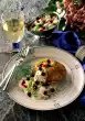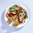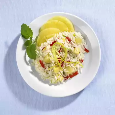 Finely dice the cheese. Mix rice, cheese, pineapple, spring onions and paprika with lemon juice and pineapple juice. Season with salt and pepper. Cut 1 slice of pineapple in half, cut the halves horizontally and garnish the edge of the plate with pineapple and lemon balm.
