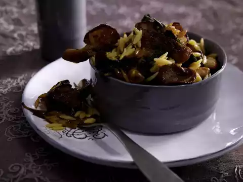 Stir now and then. In the meantime, wash the sage and pluck the leaves from the stems. Sort the mushrooms. Heat 1 tablespoon of oil in another pan. Fry the remaining onion cubes, sage leaves and mushrooms for about 5 minutes.