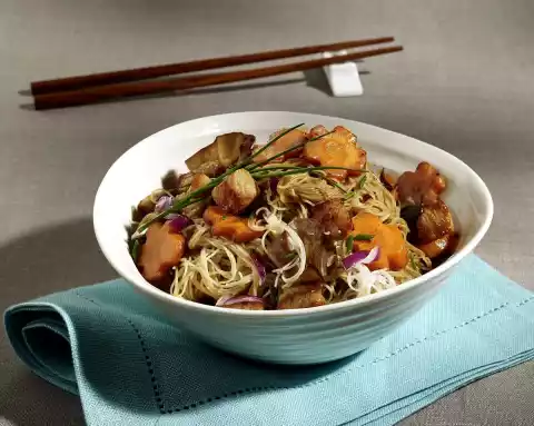 Peel and finely chop the onion. Loosen the noodles with a fork, drain and allow to drain. Wash the meat, dab dry and cut into small cubes. Heat oil in a coated pan. Fry the meat in it for about 2 minutes until golden brown, season with salt and pepper, take it out. Sauté the carrots in hot frying fat. Add 50 ml water. Simmer over high heat until the liquid has almost evaporated. Remove from heat. Add soy sauce and vinegar. Mix pasta with sauce. Also mix in meat, mushrooms and onions.