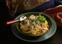 Simmer over high heat until the liquid has almost evaporated. Remove from heat. Add soy sauce and vinegar. Mix pasta with sauce. Also mix in meat, mushrooms and onions. Arrange salad in a bowl. Wash chives, dab dry, cut some stalks into rolls. Sprinkle the salad with chives and garnish with the rest of the chives