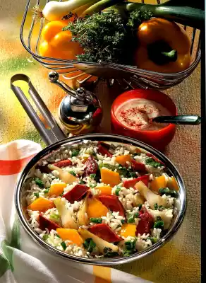 Put rice in boiling salted water and cook for 8 minutes. Clean and wash spring onions. Cut the green of the spring onions into rings and the rest into pieces. Clean, wash and chop the bell pepper. Cut meatloaf into pieces. Heat oil in a pan. Fry the bell pepper and onion pieces in it. Add meat loaf and fry well. Season with salt, pepper and paprika. Drain the rice bag. Mix the rice with the vegetables. Wash the thyme, dab dry and remove the leaves from the stems. Add to the rice pan with the spring onion rings. Flavour again. Sour cream tastes good with it