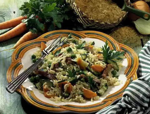 Leave to swell for about 5 minutes over a mild heat. In the meantime, peel, wash and slice the carrot. Clean, wash and cut the zucchini into sticks. Add vegetables to the rice and cook for about 15 minutes. Add meat and peas shortly before the end of cooking time and warm up as well. Wash parsley, dab dry and chop. Fold into the rice