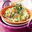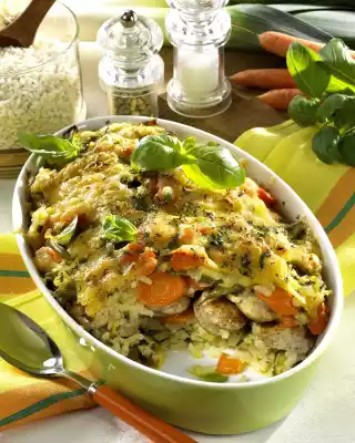 Mix 3/4 of the parsley into the rice. Season with salt and pepper. Put half of the vegetable rice into an ovenproof greased casserole dish. Spread slices of sausage on top and add the remaining vegetable rice.