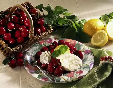Bring the milk to the boil, add 75 ml water. Let the rice swell for about 40 minutes and season with sweetener. Heat cherry jam and stir in cherries. Serve rice with cherries.