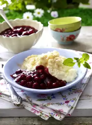 Add cherries, bring to the boil and simmer for another 1-2 minutes, stirring several times. Remove from the stove. Bring milk and salt to the boil in a pot, add rice pudding, stir and bring to the boil.