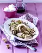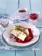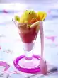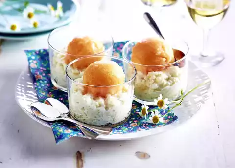 Whip the cream until stiff and stir into the cold rice pudding. Divide into 6 glasses. Cut out balls from the sorbet and arrange them on the rice, serve immediately.