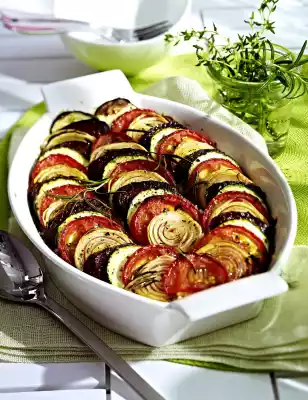 Drain the rice and put it into a greased casserole dish. Place vegetable slices and chorizo alternately on the rice. Season with salt and pepper. Pour stock and drizzle 2 tablespoons of olive oil over it. Bake in a preheated oven (electric cooker: 200 °C/ convection oven: 175 °C/ gas: see manufacturer) for approx. 40 minutes