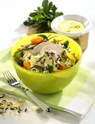 Peel, clean, wash and slice the carrots. Cook vegetables in boiling salted water for 6-8 minutes until al dente. Drain and rinse with cold water. Drain rice, drain and let cool down. For the salad dressing mix sour cream, yoghurt, milk, vinegar and curry.