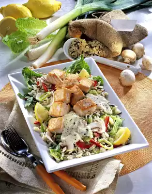 Season again if necessary. Wash the salmon, dab dry and cut into about 12 medium-sized cubes. Put about 3 cubes on each skewer. Season with salt and pepper. Heat the remaining oil in a pan and fry the skewers for about 3 minutes, turning them over. Remove and sprinkle with lemon juice. Arrange the lettuce leaves on a plate and place the rice salad on top. Arrange salmon skewers on the rice salad, garnish with lemon wedges and spread the dressing on the salad