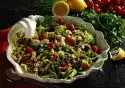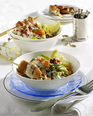 Mix yoghurt sauce into the rice. Season to taste again. Heat 2 tablespoons of oil in a pan. Fry the chicken skewers in 2 portions until golden brown, turning them over. Arrange rice salad in small bowls, garnish with lemon wedges.