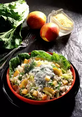 Put rice in a sieve, rinse with cold water and drain. Mix the rice, cheese, fruit and salad strips. Line a bowl with lettuce leaves and pour in the rice salad. Pour the dill-yoghurt cream over it.